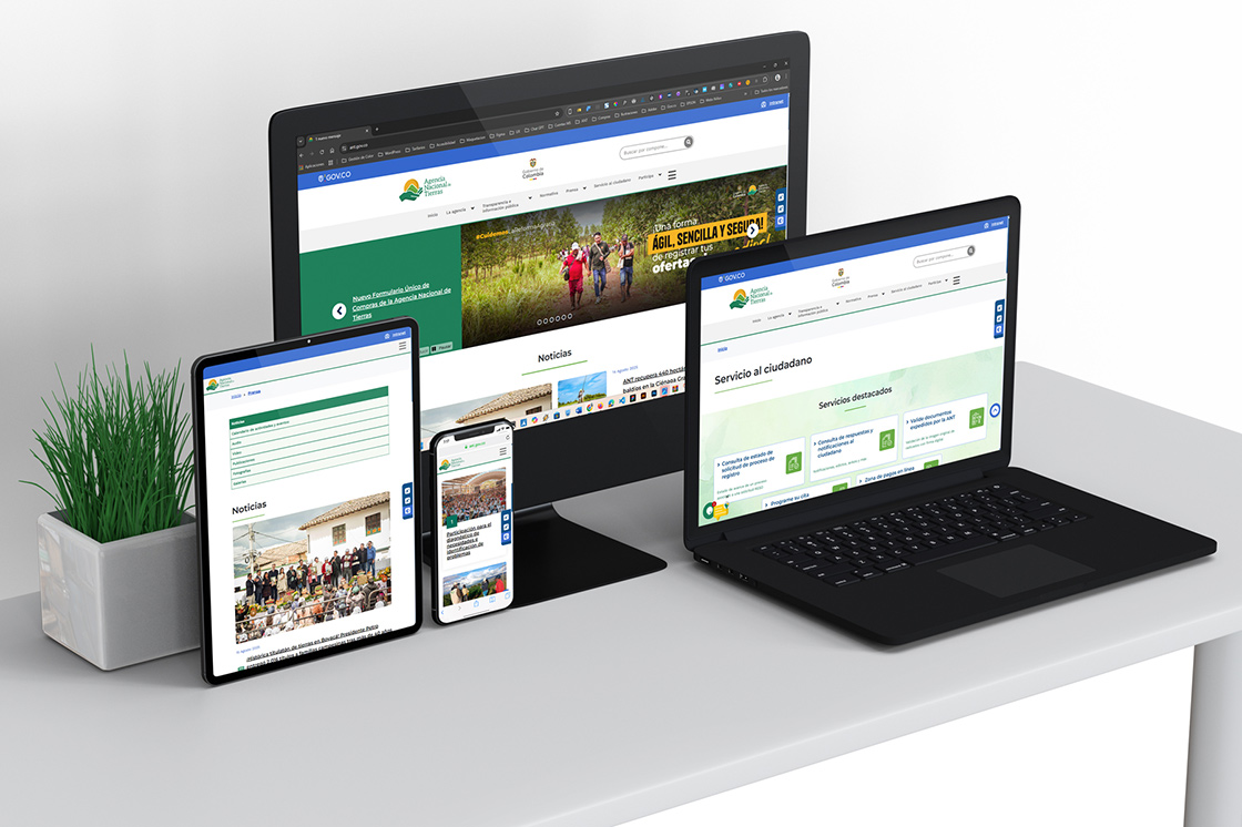 Diseño web (Maquetación HTML) del Portal de la Agencia Nacional de Tierras. El diseño del sitio web incluyó un cambio total en los componentes del home o inicio y una nueva estructura para todas las páginas internas junto con la implementación y aplicación de los lineamientos de la estrategia nacional de integración digital Gov.co para facilitar la interacción entre el Estado y el ciudadano.